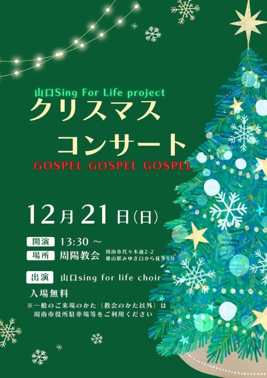 周南市・徳山の周陽教会を会場として、2025年12月21日(日)の午後、ゴスペルのクリスマスコンサートのイベントが開催されます。どうぞご来場ください。 山口Sing For Life projectクリスマスコンサートG […]